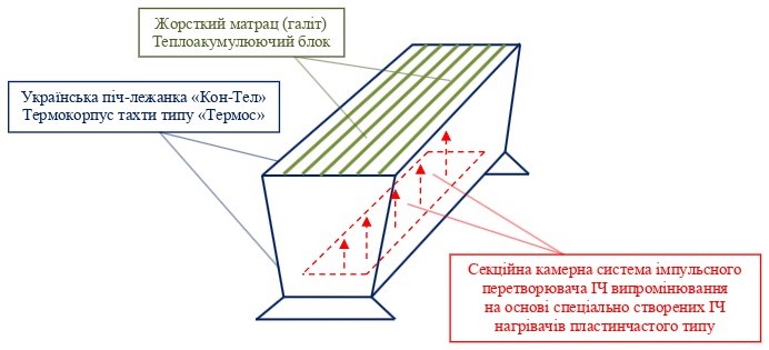► На створення довгохвильових хвиль інфрачервоного спектру випромінювання і теплих вихідних потоків повітря, збагачених негативно-зарядженими іонами парів солі та летючими фітонцидами всередині термокорпуса тахти типу «Термос» встановлена секційна камерна система імпульсного перетворювача ІЧ випромінювання на основі спеціально створених ІЧ нагрівачів пластинчастого типу із застосуванням інноваційної за своїм композиційним складом резистивних паст для їх виготовлення саме заданої конфігурації та розмірів відповідно до Технічних умов щодо їх реальної експлуатації.