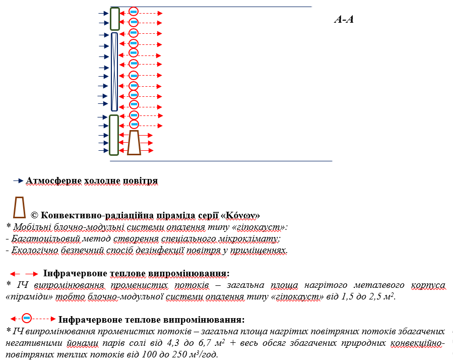 P.S. Теплове випромінювання - це електромагнітні хвилі, що випускаються тілами за рахунок їх внутрішньої енергії, а саме випромінюються тілами, що мають температуру більше 0К, тобто різними нагрітими тілами, тому і називається тепловим де має суцільний спектр, розташування та інтенсивність максимуму від якого залежать температури тіла: наприклад - це нагрітий метал або земна атмосфера (газова оболонка, що оточує планету Земля) тобто а в нашому випадку це нагрітий металевий корпус «піраміди», а саме це інфрачервоне випромінювання променистих потоків де загальна площа нагрітого металевого корпуса «піраміди» тобто блочно-модульної системи опалення типу «гіпокауст» складає від 1,5 до 2,5 м2 та гарячі негативні йони парів солі, а саме це інфрачервоне випромінювання променистих потоків де загальна площа нагрітих повітряних потоків збагачених негативними йонами парів солі складає від 4,3 до 6,7 м2 + весь обсяг збагачених природних конвекційно-повітряних теплих потоків який складає від 100 до 250 м3/год при цьому сама унікальність блочного модуля типу «гіпокауст» з природною конвекцією полягає не тільки в рівномірності реального прогрівання всього об'єму повітря в кімнатах особливим видом теплоносія, а й створення – просто ідеальних умов для конкретного досягнення оптимально-заданих ефектів термозахисту з внутрішньої сторони всіх конструкцій, що захищають, в приміщеннях будівель різного функціонального призначення, тобто саме за фактом насправді практично реально створюється своєрідна «теплова завіса», яка охоплює поверхню по всій її площі, де із загальної практики відомо, що через різні віконні отвори реально «виходить» із приміщення до 40% тепла - відповідно чим більше отвори вікон, тим інтенсивніше треба опалювати приміщення.