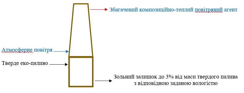 * Для створення заданої теплової потужності застосовується твердий вид еко-палива (пелети, гранули, брикети, т.ч. велика щільна тріска), який повністю згоряє у шахтний камері шаровий топки за типом «фінської свічки» для подальшого відведення високотемпературних теплових потоків щодо створення дуплекс процесів, а саме як для многозонного нагрівання до потрібної температури так і для композиційного збагачення об'ємно-повітряних потоків в процесе їх проходження з відповідною швидкістю у секційному модулі колонного типу серії «Торнадо».